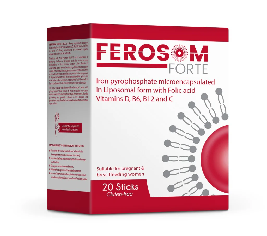 Ferosom Forte 20 Sticks هو مكمل غذائي مبتكر يحتوي على الحديد المدعوم بتكنولوجيا حديثة لتعزيز امتصاصه ودعم صحة الجسم بشكل عام. بالإضافة الى ذلك، يتميز المنتج بتركيبته التي تقلل من الأعراض الجانبية الشائعة المرتبطة بمكملات الحديد التقليدية مثل اضطرابات المعدة. على سبيل المثال، يُعد Ferosom Forte خيارا مثاليا للأشخاص الذين يعانون من نقص الحديد أو فقر الدم، حيث يعمل على تحسين مستويات الحديد في الجسم بطريقة فعالة وآمنة. لذلك، يعتبر هذا المنتج مناسبًا لدعم الطاقة والصحة العامة.
