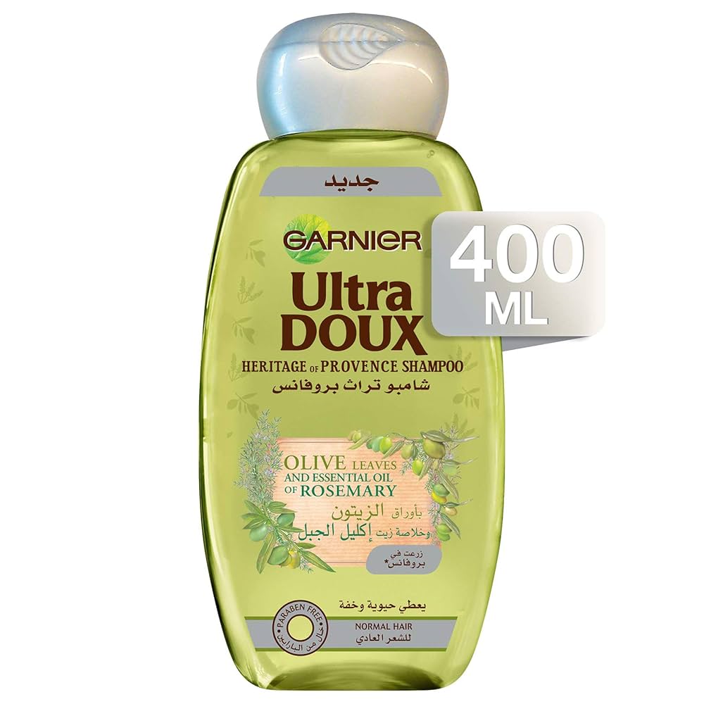 شامبو Garnier Ultra Doux Olive Leaves & Rosemary Shampoo 400ml يحتوي على مزيج طبيعي من خلاصة أوراق الزيتون وإكليل الجبل، ويعمل بلطف على تنظيف فروة الرأس وتقوية ألياف الشعر. كما يساعد على تنقية الشعر من الشوائب ومنحه لمعانًا وانتعاشًا طبيعيًا.