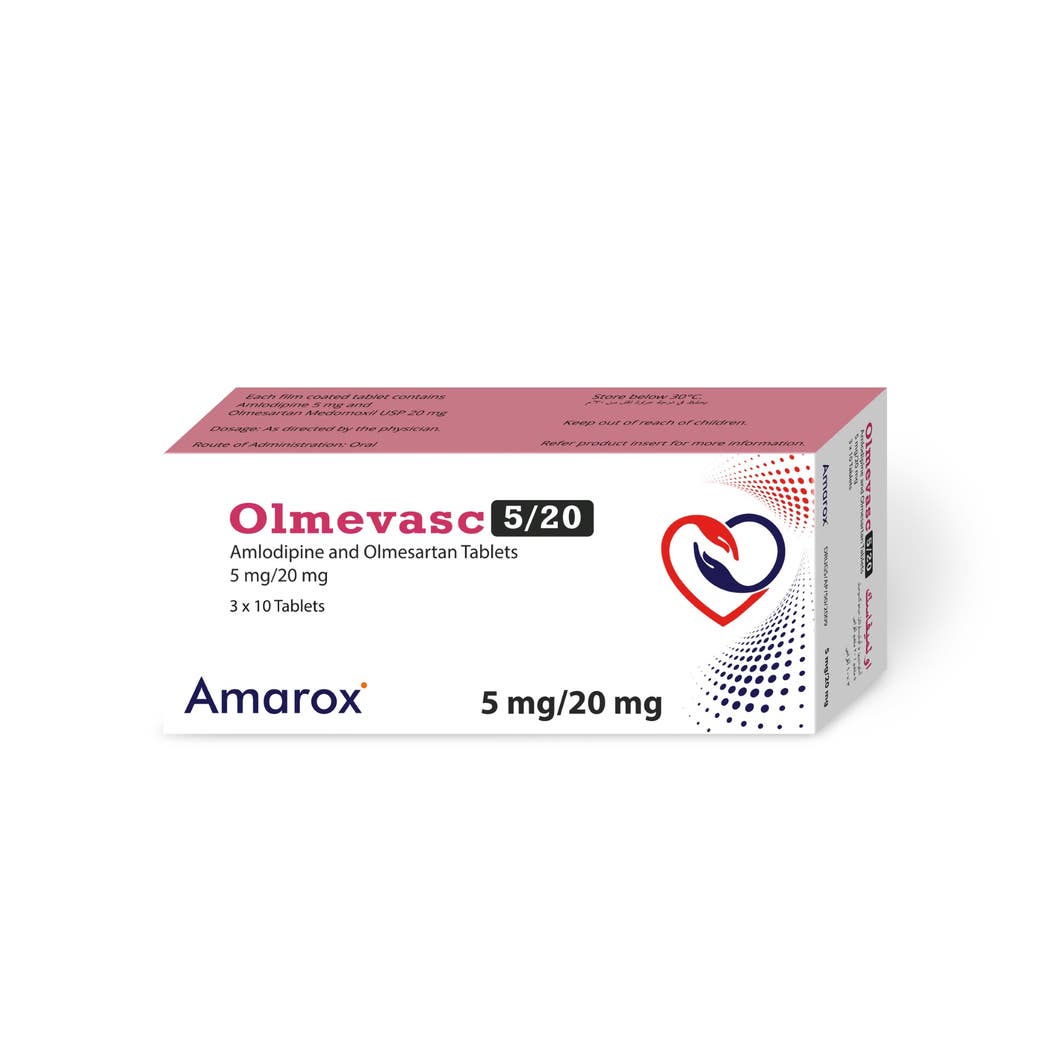 Olmevasc 5mg/20mg 30 Tablets هو دواء مركب يحتوي على مادتي Amlodipine (من حاصرات قنوات الكالسيوم) و Olmesartan (من مضادات مستقبلات الأنجيوتنسين II – ARBs). يعمل هذا الدمج الدوائي على خفض ضغط الدم المرتفع بآليتين متكاملتين؛ حيث يساعد Amlodipine على إرخاء الأوعية الدموية وتحسين تدفق الدم، بينما يقوم Olmesartan بمنع تأثير مادة الأنجيوتنسين II التي تسبب تضيق الأوعية الدموية. وبذلك يقلل Olmevasc من خطر الإصابة بالسكتة الدماغية، النوبات القلبية، والمضاعفات الكلوية الناتجة عن ارتفاع ضغط الدم المزمن.