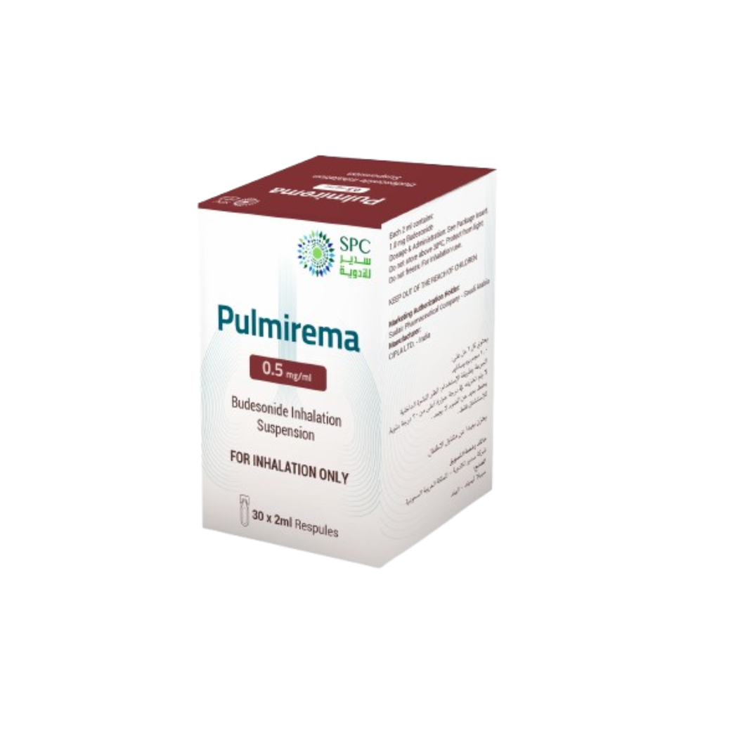 Pulmirema 0.5mg/ml Inhalation Suspension 30pcs 2ml هو محلول معقم للاستنشاق يحتوي على المادة الفعالة Budesonide بتركيز 0.5mg/2ml. يستخدم عبر جهاز النيبولايزر لعلاج والسيطرة على أعراض الربو عند الأطفال من عمر 12 شهرًا حتى 8 سنوات. يعمل الدواء على تقليل الالتهاب في مجرى التنفس ومنع نوبات الربو، كما يساعد على تحسين وظائف الرئة عند الاستعمال المنتظم يوميًا. يبدأ التحسن خلال يومين، بينما قد يستغرق الوصول إلى الفعالية الكاملة حتى 4 أسابيع.