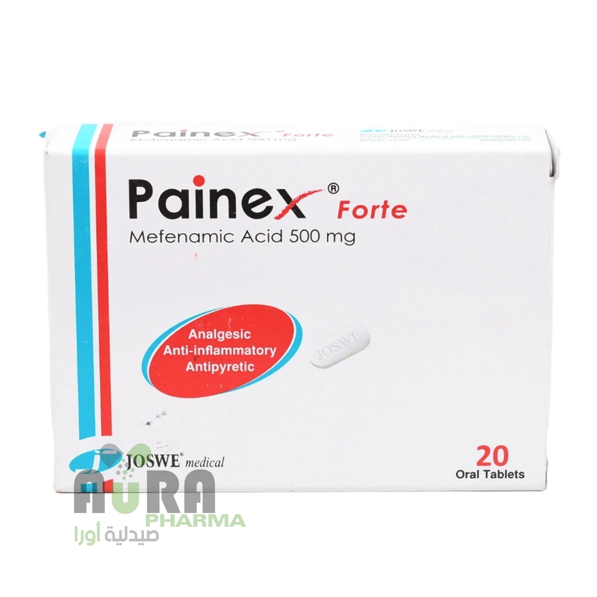 Painex Fort 500mg هو دواء مسكن قوي للألم ومضاد للالتهاب يحتوي على Mefenamic Acid. يستخدم من أجل تسكين الآلام المتوسطة إلى الحادة مثل آلام الدورة الشهرية، آلام العضلات، الصداع، ألم الأسنان، وآلام العمود الفقري والمفاصل، مما يساعد في تحسين جودة الحياة اليومية.