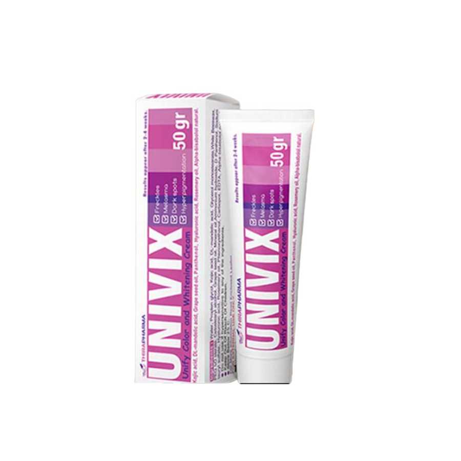 يُستخدم كريم Univix Whitening Cream لتفتيح البشرة وتقليل ظهور البقع الداكنة والتصبغات. وبالتالي، يمنح البشرة مظهرًا متجانسًا وأكثر إشراقًا. إلى جانب ذلك، يساعد في توحيد لون البشرة وجعلها أكثر نعومة.