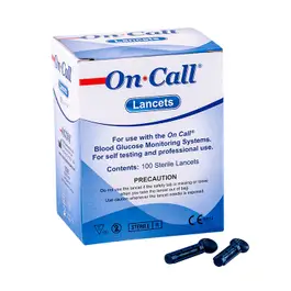 مشارط أون كول (On-Call) المعقمة والمصممة لتوفير تجربة وخز مريحة وسلسة بفضل رأسها الرفيع المصقول بدقة. تضمن هذه المشارط الحصول على عينة دم كافية بأقل شعور بالألم، مما يجعلها مثالية للفحص اليومي المتكرر. تتميز بتصميم قياسي يتوافق مع معظم أقلام الوخز الشائعة، وهي مخصصة للاستخدام لمرة واحدة لضمان أعلى مستويات النظافة والأمان. العبوة تحتوي على 100 مشرط.